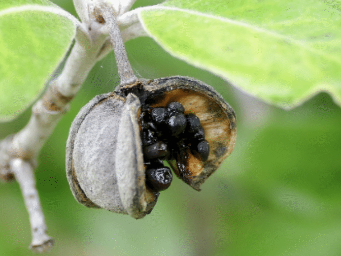 Left: Karo seed pod open showing the sticky karo seeds. Photo credit: Annette de Raat