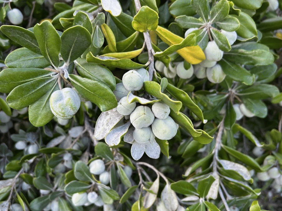 They are also covered underneath in downy, grey, felt-like hairs (tomentose) that help prevent salt penetration to the leaf’s surface, another clever survival technique. Tomentose also occurs on the soft new-season growth that readily shoots from branch tips.