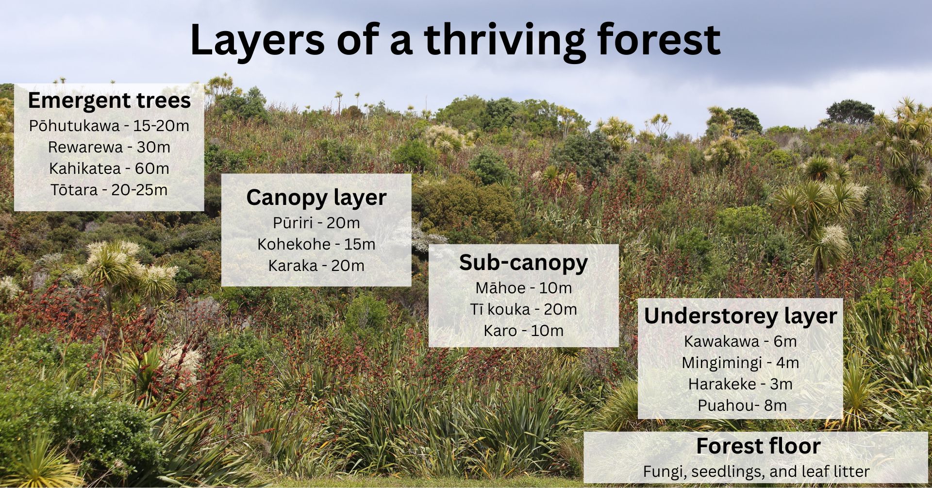 The image below illustrates the forest layers and some of the key native species found at each level on Tiritiri Matangi.